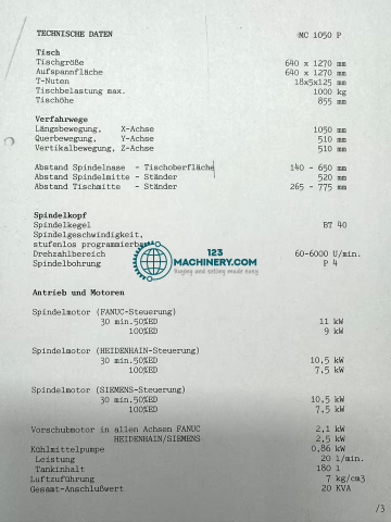 x-Weg: 1000 mmy-Weg: 300 mmz-Weg: 400 mmSteuerung: SiemensTyp: 810Werkzeugaufnahme: ISO 40Gesamtleistungsbedarf: kWMaschinengewicht ca.: tRaumbedarf ca.: m