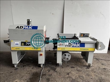 SMIPack FP560A L sealer and shrink tunnel, 2011, Semi auto L sealer, sealing bar 560mm x 430mm, max pack height 230mm, up to 1500 packs per hour, mobile, 1ph, then feeds onto SMIPack T450 shrink tunnel, adjustable temp and speed controls, mobile, 3Ph