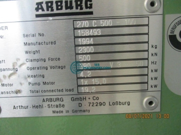 Ref. no.: 17540Hersteller: ARBURGYear of construction: 1994Clamping unitClamping force: 50 tonOpening stroke: 350 mmDistance between tie bars: 270 X 270 mmMould height min.: 200 mmPlaten size (h x v): 405 X405 mmInjection unitScrew diameter: 25 mmInjection volume: 67 cm³Shot weight: 61 gInjection pressure: 2500 barMeasurements and weightDimensions: 3,3 X 1,5 X 2,0 mMachine weight: 2400 kg