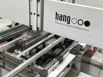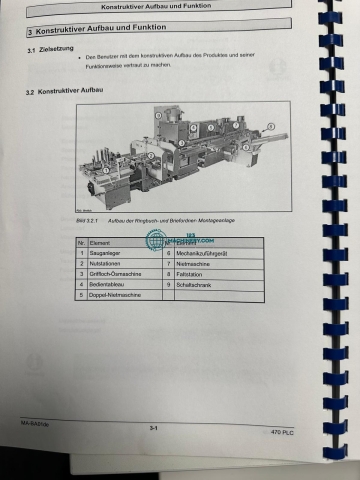 ang 470 PLC Ring Binder & Lever arch Assembly LineHigh-performance automatic production line for ring bindersBrand: HangYear: 2007Model: 470 PLC – FANUC ControlledThis fully automatic line is designed for efficient production of ring binders according to customer specifications. The machine is equipped with multiple processing stations and a Fanuc PLC control with touchscreen interface.Main Components:Sheet feeder (Saug-Anleger)Creasing stationGripping hole punching unit (Griffloch-Ösmaschine)Double riveting stationOperator control panel (Fanuc QuickPanel View)Mechanic feeding unitSingle riveting stationFolding stationTechnical SpecificationsPLC Control: FANUC with memory for up to 1000 programs and modem for remote supportSetup time: Approx. 2-3 minutesMaterial Range:Cover height: 120 – 400 mmCover width: 300 – 820 mmMaterial thickness: Min. 1 mm – Max. 3.5 mmRivet spacing: 90 – 300 mmMachine Condition- In excellent working condition-Touch panel with program counter, total counter and production statistics- Fanuc QuickPanel View display- Ready for immediate production- Available for inspection in our warehouseProduction Counter Information (Machine Usage)Day Counter: 250,895 cyclesTotal Counter: 9,495,162 cyclesProduct Counter: 1,336,482 unitsOperating Time: 12,838 hours